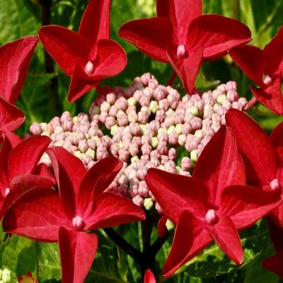 Парасолькова гортензія з рідкою плоскою формою кольорів. Маленькі центральні квіточки жовтувато-рожевого кольору. Маргінальні квіти темно-червоні, зіркоподібної форми. Забарвлення кольорів залежить від кислотності ґрунту. У лужному або нейтральному грунті квіти будуть рожеві, але чим вища кислотність, тим червонішим буде колір пелюсток. Цвіте з липня до серпня.