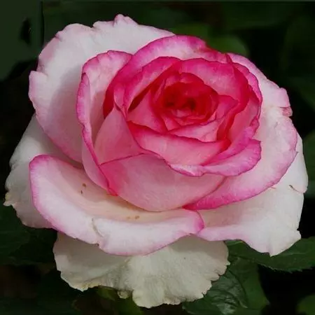 Келихоподібних квітки з 17-25 пелюсток двокольорового забарвлення: білий з широкою темно червоною облямівкою. Листя темно-зелена, глянцева, кущ практично без шипів.